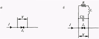 Рис. 6.5. Вольт-амперная характеристика джозефсоновского перехода и схема ее измерения: а — обычный (s—n—х) - переход; 6 — переход, шунтированный небольшим сопротивлением