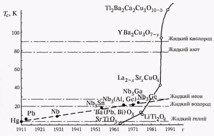 В исследование металлооксидных сверхпроводников и поиск новых сверхпроводящих материалов этого типа включилась вся мировая научная общественность. В 1987 г. на керамике Y—Ва—Си—О была достигнута температура сверхпроводящего перехода 92 К, и, тем самым, был преодолен азотный барьер, что еще сильнее подхлестнуло массовый интерес исследователей к новым высокотемпературным сверхпроводникам. Затем температура сверхпроводящего перехода была поднята до 125 К в соединениях таллия. Регулярно стали появляться сенсационные заявления о сверхпроводимости при комнатных температурах, но они быстро «закрывались». Увы, после экспоненциального роста значение Тс фактически вышло на плато в начале 90-х годов. К настоящему времени рекорд критической температуры принадлежит ртутным соединениям с Tc~140 К. Наступил этап кропотливой, методичной работы по выяснению природы высокотемпературной сверхпроводимости и тщательному изучению ее свойств.