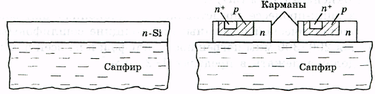 Рис. 7.9. Технология «кремний на сапфире» (КНС): а — исходная структура; б — рельефные карманы