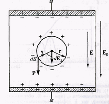 Для определения Е2 предположим, что внутри сферы нет молекул, кроме рассматриваемой. При этом плотность связанных зарядов на поверхности сферы в каждой точке одинакова и равна поляризованности (σ = Р). Плотность связанных зарядов, индуцированных на бесконечно малой площади dS поверхности этой сферы, будет равна -Рn, Кл/м2, т.е. нормальной составляющей вектора Р к этой поверхности С помощью закона Кулона можно определить напряженность поля dE2 действующего в центре сферы со стороны электрического заряда РndS, индуцированного на площади dS. Проинтегрировав заряд dE2 по всей поверхности сферы, найдем поле Е2: