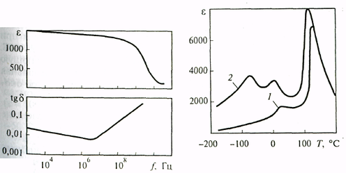 Спонтанная поляризация наблюдается в диапазоне частот от постоянного напряжения до СВЧ. Диэлектрическая проницаемость титаната бария, начиная с частоты примерно 107 Гц, снижается, а диэлектрические потери возрастают (рис. 7.5). В слабых электрических полях при комнатной температуре величина ε ВаТiO3 лежит (в зависимости от марки материала) в пределах 500—20 000, tgδ — 0,02-0,03.