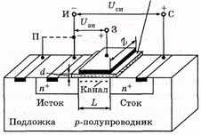 Реальная структура МДП-транзистора с n-каналом, выполненного на основе полупроводника, показана на рис. 4.2. Металлический электрод, создающий эффект поля, называют затвором (3). Два других электрода называют истоком (И) и стоком (С). Эти электроды в принципе обратимы. Стоком является тот из них, на который ( при соответствующей полярности напряжения) поступают рабочие носители канала. Если канал n-типа, то рабочие носители — электроны и полярность стока положительная. Исток обычно соединяют с основной пластиной полупроводника, которую называют подложкой (П).