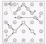 Рис. 62. Механизм диффузии катиона в кристаллической решетке (О— анион, +О— катион):