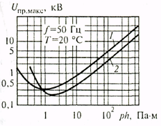 Рис. 5.6. Зависимость пробивного напряжения Uпр.макс воздуха (1) и неона (2) 2 от от произведения давления газа Р на расстояние между электродами h