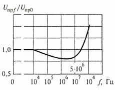 Рис.5.7. Частотная зависимость отношения пробивного напряжения воздуха при данной чачтоте к пробивному напряжению на постоянном токе.