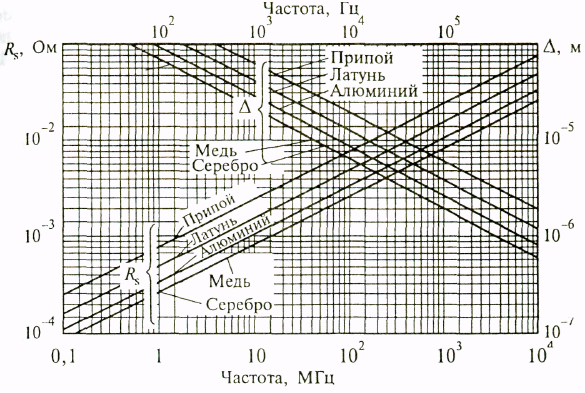 Зависимость Rs и ∆от частоты поля для. некоторых важнейших металлов и сплавов высокой проводимости приведены на рис. 12.7.