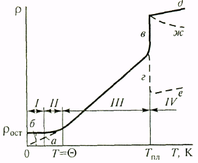 ис. 12.5. Типичная зависимость удельного сопротивления ρ металлических проводников от температуры Т в широком интервале (пояснение см. в тексте) металлов.