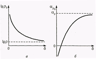 Рис. 12.6. Зависимость удельного сопротивления ρδ (а) и температурного коэффициента удельного сопротивления αρδ (б) металлической пленки от ее толщины δ