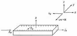 отклоняющая электроны в отрицательном направлении оси у (дрейфовая скорость электрона направлена против тока). Однако электроны не могут долго двигаться в направлении оси г/, поскольку они достигают границы проводника. По мере того как они там скапливаются, нарастает электрическое поле, направленное вдоль оси у и противодействующее движению и дальнейшему накоплению электронов. В состоянии равновесия это поперечное поле (или поле Холла) Еу компенсирует силу Лоренца, и ток идет лишь в направлении оси х. Две величины представляют здесь интерес. Одна из них — это отношение поля вдоль проводника Ех к плотности тока jx: