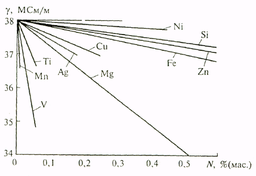 Химические элементы, образующие с алюминием твердые растворы, увеличивают механическую прочность, но снижают удельную электропроводность. Наиболее сильно снижают удельную электропроводность Cr, Li, Mg, Nb, Ti, V, Mn, поэтому их количество в электротехнических алюминиевых сплавах должно быть ограниченным. Железо также повышает механическую прочность сплавов, но При этом мало влияет на их удельную электропроводность, так как не входит в твердый раствор, а присутствует в алюминии в виде дисперсных частиц.