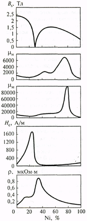 ис. 15.1. Зависимость магнитных свойств и удельного сопротивления железоникелевых сплавов от содержания никеля