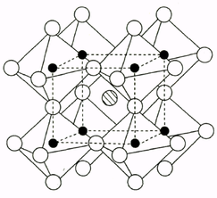 ПЕРОВСКИТ, минерал CaTiO3; иногда содержит изоморфные примеси. Как правило, Са замещается на Се, Ti-на Nb и Та, что приводит к образованию кнопита СеТЮ3 (содержит до 8% оксидов РЗЭ), дизаналита (Са, Na) (Nb, Ti)O3 (до 26% Nb20s) и лопарита (Се, Na, Ca) (Nb, Ti) О, (до 32% оксидов РЗЭ). П. кристаллизуется в ромбич. сингонии; Рстп, а — = 5,3370, Ъ = 7,6438, с = 5,4439, : = 4. Атомы Са (координац. число 12) находятся внутри кубооктаэдрич. полостей каркаса, образованного октаэдрами, к-рые связаны друг с другом вершинами; атомы Ti находятся внутри октаэдров. П. образует псевдокубич. или октаэдрич. кристаллы с плохой спайностью. Твердость П. по минералогии, шкале 5,5-6,0, плотн. 4000-4300 кг/м3. Парамагнитен. Разлагается кипячением с H2S04 и сплавлением с KHSO4. Крупные кристаллы бесцветные или от темно-коричневого до черного цвета. П.