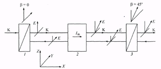 оси пропускания которых установлены под углом 45°, и фарадеевского магнитооптического элемента, расположенного между ними. Физические параметры фарадеевского элемента таковы, что при прохождении через него линейно-поляризованного света плоскость поляризации поворачивается на 45°. При распространении света вдоль оси X луч проходит через поляризатор /, ось пропускания которого направлена вдоль оси Z, фара-деевский элемент 2, поворачивающий плоскость поляризации света на угол +45°, и анализатор 3, ось пропускания которого совпадает с направлением поляризации света, прошедшего через фарадеевский элемент.