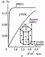ис. 14.5. Направления легкого и трудного намагничивания и кривые намагничивания в разных направлениях монокристаллов железа (а), никеля (б) и кобальта (в).