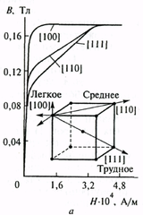 Монокристаллы ферромагнетиков обладают анизотропией магнитных свойств. В них существуют кристаллические направления легкого и трудного намагничивания. Для намагничивания монокристалла до технического насыщения вдоль кристаллографического направления легкого