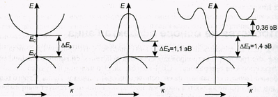 Зона проводимости полупроводника может быть образована из нескольких перекрывающихся между собой разрешенных энергетических зон. В этом случае энергетическая диаграмма зоны проводимости в k-пространстве может иметь минимум, смещенный относительно точки k = 0 (рис. 9.11, б), что имеет место в кремнии. В кристалле арсенида галлия имеются два минимума (рис. 9.11, в) в кристаллографическом направлении (100), которые называются энергетическими долинами. Полупроводник в этом случае называется двухдолинным. Минимальная энергия электронов, имеющая место при k = 0, соответствует нижней границе зоны проводимости. Верхняя долина отделена от нижней долины энергетическим зазором ∆E= 0,36 эВ.