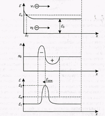 По мере формирования домена возрастает напряженность поля внутри домена и уменьшается вне его пределов, при этом снижается дрейфовая скорость и, соответственно, ток. После образования домена (момент t1) в кристалле установится минимальный ток Jmin = qno μ1 E1 Рис. 9.14