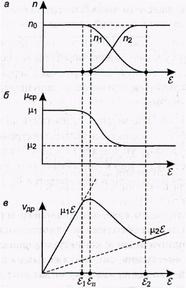 В слабых полях n1= no, n2 = 0, μCP = μ1, j = q n1μ1 E . По мере роста E, начиная с некоторой величины (E1, электроны переходят из нижней долины в верхнюю, поэтому nl уменьшается, n2 увеличивается (рис. 9.12, а), μср уменьшается (рис. 9.12, б), а рост vдр замедляется (рис. 9.12, в).