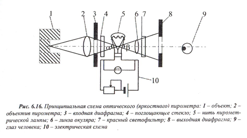 Принцип работы пирометра основан на сравнении яркостей нагретого тела 1 и нити накаливания пирометрической лампы 5 в монохроматическом свете. Измерения выполняются следующим образом. Пирометр визируют на объект в точку измерения температуры. Объект воспринимается через красный светофильтр 7 в виде красного фона определенной яркости. Подбирая соответствующую величину электрического тока в цепи лампы 5, добиваются такого же свечения нити накаливания, как и у объекта. В этом случае нить становится неразличима на фоне объекта, «исчезает». Измерительный прибор в этом случае дает значение яркостной температуры тела.