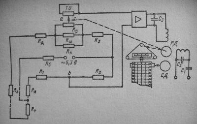 При нарушении равновесия мостовой схемы прибора вследствие изменения сопротивления Rт термометра на вход усилителя подается напряжение небаланса с вершин а и b. Это напряжение усиливается усилителем до значения, достаточного для приведения в действие реверсивного двигателя. Выходной вал двигателя, кинематически связанный с движком реохорда и кареткой, передвигает их до тех пор, пока напряжение небаланса, уменьшаясь, не станет равным нулю (точнее, меньше той величины его, которую чувствует усилитель). При достижении равновесия мостовой схемы ротор реверсивного двигателя останавливается, а движок реохорда и каретка с указателем и пером занимают положение, соответствующее измеряемому сопротивлению термометра. Положению равновесия мостовой схемы соответствует уравнение:
