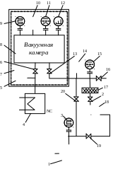 Вакуумная система для получения сверхвысокого вакуума содержит подогреваемый вакуумный блок 7. Прогрев до 400 °С уменьшает газовыделение всех элементов вакуумной системы, непосредственно подключаемых к сорбционному насосу 4. Камера снабжена несколькими манометрами 9, 10, 11, обеспечивающими измерение давления от атмосферного до сверхвысокого вакуума. Манометр 5 контролирует работоспособность насоса 4. Высоковакуумная часть системы собрана на двух насосах: 1 и 18. Клапан 16 служит для подключения течеистекателей к вакуумной системе, а манометры 14 и 15 – для измерения давления в области среднего и высокого вакуума. В качестве низковакуумного насоса 1 чаще всего применяют механический насос.