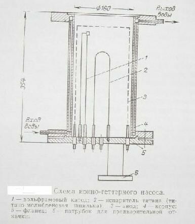 Испарение титана на стенки водоохлаждаемого корпуса 4 насоса производится из твердой фазы с прямоканальных испарителей 2, представляющих собой молибденовый U – образный керн, на который нанесен слой иодидного титана. Ионизация, необходимая для откачки инертных газов и углеводородов, осуществляется электронами, эмитируемыми термокатодом 1. Эффективность ионизации повышена за счет увеличения длины бега электронов. Это достигается применением прозрачного для электронов анода 3, на который подается положительное относительно катода напряжение 1000-1200 В. Анод 3, выполненный из молибденовой проволоки, используется еще и в качестве внутреннего нагревателя для обезгаживания насоса при подготовке его к работе. Коллектором ионов является корпус насоса с нанесенной титановой пленкой, в которую и внедряются образовавшиеся ионы. Таикм образом химически активные газы поглощаются пленкой титана, непрерывно наносимой на внутреннюю поверхность корпуса насоса, а откачка