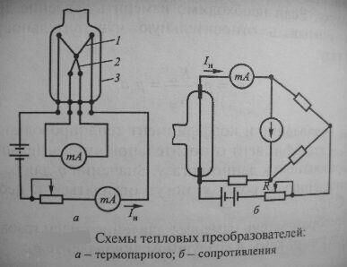 Тепловые преобразователи в зависимости от способа измерения температуры делятся на термопарные и преобразователи сопротивления. В термопарном преобразователе температура нити 1 измеряется термопарой 2. Электроды расположены в стеклянном или металлическом баллоне 3, имеющем патрубок для подключения к вакуумной системе. ТермоЭДС термопары измеряется милливольтметром, ток накала нити регулируется реостатом и измеряется миллиамперметром. В преобразователе сопротивления для измерения температуры используется зависимость сопротивления нити от температуры.