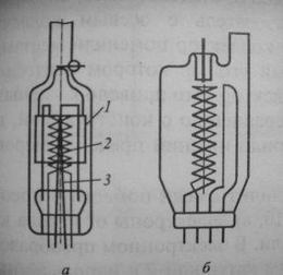В схеме с внешним коллектором электроны, летящие от анода к сетке, совершают вокруг ее витков ряд колебаний, что увеличивает длину траектории электронов и повышает вероятность ионизации молекул остаточных газов. Это делает схему с внешним коллектором более чувствительной, несмотря на то, что часть положительных ионов, образовавшихся между сеткой и катодом, не участвует в измерении давления. Схематично конструкция электронного преобразователя с внешним коллектором представлена на рис. Коллектор ионов 1 имеет форму цилиндра с электрическим вводом в верхней части баллона, сетка 2 – форму двойной спирали с двумя выводами для обезгаживания путем пропускания электрического тока. Катод 3 вольфрамовый. Пределы давлений, которые могут быть измерены таким манометрическим преобразователем, составляют 1 – 10-5 Па.