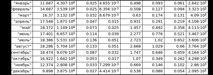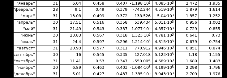 Таблица полученных результатов, рассчитанных для остальных месяцев: