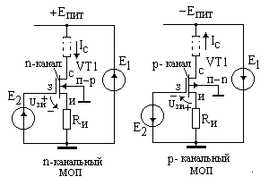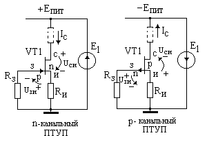 | | Для обеспечения рабочей точки в активной области характеристик необходимо: 1.полярность напряжения UЗИ должна быть запирающей, 2.полярность напряжения UСИ совпадает с полярностью UЗИ. | ||