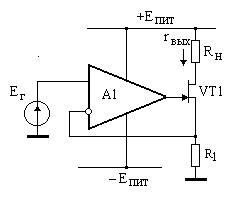 | | Дано: ОУ (А1): Кu д= 104, rвых ОУ=50 ом, VT1 =Si, Y21=100 mA/В, rси= 50кОм. R1= 1к, Rн =2к, Ег=+2В. Опр: Iн, rвых. |