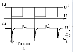 К точке 2(см. рис. 8) подключается вход ЖМВ. Для того чтобы одновибратор стабильно генерировал на выходе импульсы необходимо, чтобы запускающий импульс был не больше половины генерируемого импульса. ЖМВ переключится, когда на его входе напряжение будет U*. Поэтому при T = Tиmin / 2, U2 должно быть равно U*(см. рис. 8).