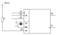 Сигнал сброса, т. е. окончания импульса в триггере, формируется с помощью RC-звена: времязадающий конденсатор C подключается между выводами микросхемы 10 и 11, резистор R включается от вывода 09 к положительной шине питания 5В.
