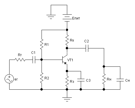 Осуществить схемы включения ОЭ, ОБ, ОК, используя конденсаторы C1-C3. Для одной из схем (указано) дать малосигнальную схему замещения и вычислить параметры Ku, Ki, rвх, rвых.