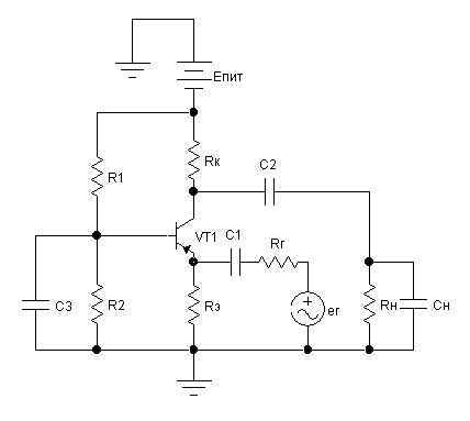 Вычислить граничные частоты fн, fв для этой схемы. Оценить искажения, возникающие при усилении идеального прямоугольного импульса малой амплитуды (tф, δ) и максимально допустимую длительность импульса (Tи при спаде вершины δ < 20%), привести осциллограммы Eг и Uвых.