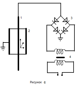 На рисунке 6: 1-осевой (коронирующий) электрод, выполненный из металлической струны или стержня, 2-циллиндрическая оболочка, 3-выпрямитель, 4-трансформатор.