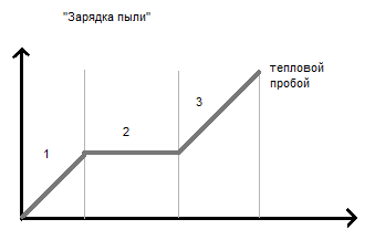 Область 1: в газе всегда имеются ионы в небольшом количестве за счет действия ионизирующего излучения, температуры и трения о стенки воздуховодов. С ростом напряжения все большее число ионов доходит до электродов.