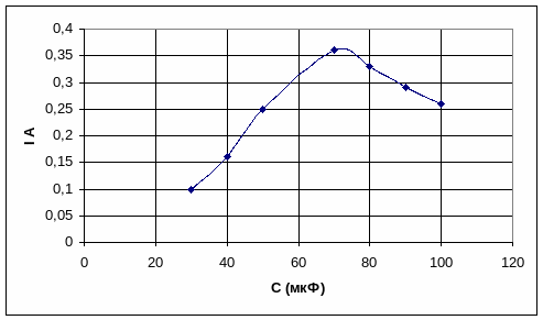 3. Включили последовательно с индукционной катушкой батарею конденсаторов. Установили напряжение 6 В. Изменяя емкость батареи конденсаторов, получили режим резонанса напряжений.