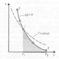 Работа, совершаемая газом при адиабатическом расширении 1 – 2 (численно равная площади под кривой), меньше, чем при изотермическом процессе. Это объясняется тем, что при адиабатическом расширении происходит охлаждение газа, тогда как при изотермическом – температура поддерживается постоянной за счет притока извне эквивалентного количества теплоты