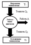 епловые машины могут иметь разную конструкцию. Это может быть паровой двигатель, двигатель внутреннего сгорания, реактивный двигатель. Любой тепловой двигатель работает по замкнутому циклу и имеет нагреватель, рабочее тело двигателя и холодильник. В процессе работы теплового двигателя рабочее тело двигателя получает от нагревателя количество теплоты Q1, совершает работу A и передает холодильнику количество теплоты Q2<Q1. Для замкнутого цикла изменение внутренней энергии равно нулю (∆U=0). Следовательно, согласно I началу термодинамики, работа, совершаемая двигателем, равна A=Q1-Q2 Коэффициентом полезного действия (КПД) теплового двигателя называется отношение работы, совершаемой двигателем, к количеству теплоты, полученному от нагревателя η=Q1-Q2/Q1 КПД тепловой машины всегда меньше единицы η=1-Q2/Q1 Следовательно, невозможно всю теплоту превратить в работу. Ученые всегда стремились повысить КПД. В первой половине XIX в. французский ученый Сади Карно показал, что максимально возможное значение КПД тепловой машины равно ηmax=T1-T2/T1=1-T2/T1, где T1 - температура нагревателя, T2 - температура холодильника. Из сравнения уравнений (4.18) и (4.19) следует, что ηmax ≥ η или 1-T2/T1≥1Q2/Q1. Отсюда Q2/T2≥Q1/T1 На основании этого неравенства можно прийти к понятию энтропия и второму началу термодинамики. Повышение КПД тепловых двигателей и приближение его к максимально возможному значению - важнейшая техническая задача. Однако, все тепловые двигатели выделяют большое количество теплоты, что называется тепловым загрязнением, и выбрасывают в атмосферу вредные для растений и животных химические соединения.