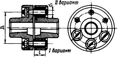 уфта упругая втулочно-пальцевая (МУВП).Благодаря легкости изготовления и замены резиновых элементов эта муфта (см.рис.) получила распространение, особенно в приводах от электродвигателей с малыми и средними крутящими моментами. Муфты нормализованы для диаметров валов до 150 мм и соответственно крутящих моментов до 15000 Н·м. Упругими элементами здесь служат гофрированные резиновые втулки (I вариант) или кольца трапецеидального сечения (II вариант). Из-за сравнительно небольшой толщины втулок муфты обладают малой податливостью и применяются в основном для компенсации несоосности валов в небольших пределах (Δa ≈1...5 мм; Δr ≈0,3...0,6 мм; Δα ≈ до 1°).