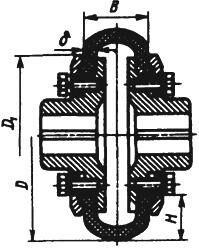 уфта с упругой оболочкой. Упругий элемент муфты (см. рис.), напоминающий автомобильную шину, работает на кручение. Это придает муфте большую энергоемкость, высокие упругие и компенсирующие свойства (Δr ≈2...6 мм, Δα ≈2...6°, угол закручивания до 5...30°). Муфта стандартизована и получила широкое распространение. Нагрузочная способность муфты ограничивается потерей устойчивости и усталостью резиновой оболочки. В первом приближении можно рекомендовать расчет прочности оболочки по напряжениям сдвига в сечении около зажима (по D1): τ = 2TK / (πD21δ)≤[τ]. По экспериментальным данным, [τ] ≈ 0,4 МПа.