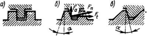 аспространенные формы кулачков изображены на рис. (сечение цилиндрической поверхностью). Прямоугольный профиль (рис., а) требует точного взаимного расположения полумуфт в момент включения. Кроме того, в таких муфтах неизбежны технологические боковые зазоры и связанные с этим удары при изменении направления вращения. Зазоры увеличиваются при износе кулачков. Трапецеидальный профиль (рис., б, в) не требует точного взаимного расположения полумуфт в момент включения, а боковые зазоры компенсируются изменением глубины посадки кулачков. Симметричные профили кулачков - реверсивные, несимметричные - нереверсивные. В муфтах с трапецеидальными кулачками возникают осевые силы. Fa (рис., б), которые стремятся раздвинуть полумуфты и затрудняют включение; в этом отношении муфты с прямоугольными кулачками обладают преимуществом. Значение угла α трапецеидального профиля выбирают таким (обычно 2...5°), чтобы обеспечивалось самоторможение или чтобы не создавать большой постоянной нагрузки на механизм отводки. Включение кулачковых муфт при относительном вращении валов всегда сопровождается ударами, которые могут вызвать разрушение кулачков. Поэтому такие муфты не рекомендуют применять для включения механизма под нагрузкой и при больших скоростях относительного вращения (υ ≥ l м/с).