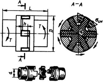 Муфта с резиновой звездочкой (см. рис.). Состоит из двух полумуфт с торцовыми выступами и резиновой звездочки, зубья к