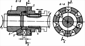 Муфты кулачковые. На торцах полумуфт 1 и 2 (см. рис.) имеются выступы (кулачки) 3. В рабочем положении выступы одной полумуфты входят во впадины другой. Для включения и выключения муфты одну из полумуфт 2 устанавливают на валу подвижно в осевом направлении. Подвижную полумуфту перемещают с помощью специального устройства - отводки. Вилку отводки располагают в пазу 4. Па чертеже штриховой линией показано выключенное положение полумуфты 2. Кольцо 5 служит для центровки валов. Несоосность валов резко снижает работоспособность кулачковых муфт. Чаще всего кулачковые и зубчатые сцепные муфты располагают на одном валу и используют для переключения скоростей.