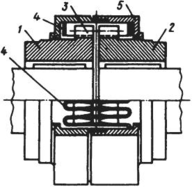 уфта зубчато-пружинная, или муфта со змеевидными пружинами. Полумуфты 1 и 2 (см. рис.) имеют зубья 3 специального профиля, между которыми размещается змеевидная пружина 4. Кожух 5 удерживает пружину в рабочем положении, защищает муфту от пыли и служит резервуаром для смазки.
