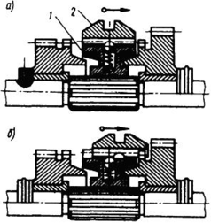 Для устранения ударов при включении в зубчатых муфтах широко применяют синхронизаторы (например, в коробках скоростей автомобилей). Синхронизаторы выравнивают скорости валов перед их соединением. Принцип работы синхронизатора поясним с помощью рис. Конструкция зубчатой муфты, предназначенной для переключения скоростей в коробке передач, здесь дополнена двусторонней конической фрикционной муфтой 1, которая и является синхронизатором. При перемещении обоймы 2 с внутренними зубьями вправо или влево она через шарик передает осевую силу конусной полумуфте синхронизатора и сцепляет ее с конусной полумуфтой одной из шестерен (рис. 17.29, а). Проскальзывание, которое наблюдается при включении фрикционных муфт, позволяет плавно разгонять ведомые элементы. Также и здесь при включении синхронизатора происходит выравнивание угловых скоростей ведущего вала и ведомой шестерни. Дальнейшим перемещением обоймы включается зубчатая муфта (рис. 17.29, б). Разгон ведомых элементов производят, как правило, на холостом ходу. Поэтому фрикционные муфты синхронизаторов рассчитывают на передачу момента, необходимого для преодоления инерционных нагрузок, возникающих при разгоне.
