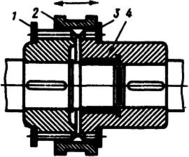 уфты зубчатые сцепные. По устройству и методике расчета эта муфта (рис.) подобна зубчатой компенсирующей муфте с той разницей, что здесь обойма 2 изготовляется подвижной и управляется с помощью отводки. На рис. обойма расположена в положении "Включено". Диски 1 и 3 являются ограничителями, а втулка 4 центрирует валы и одновременно выполняет функцию подшипника при их относительном вращении (когда муфта выключена). Допускаемые напряжения смятия при расчетах прочности зубьев принимают такими же, как и для кулачковых муфт. Преимущества зубчатой муфты по сравнению с кулачковой - возможность изготовления на широко распространенном зуборезном оборудовании. При этом получают более высокую точность изготовления.