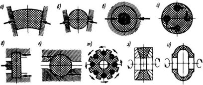 Муфты с резиновыми упругими элементами широко распространены во всех областях машиностроения для передачи малых и средних крутящих моментов. Основные типы резиновых упругих элементов муфт и схемы их нагружения изображены на рис., а - и. При выборе типа упругого элемента учитывают следующее: упругие элементы с равномерным напряженным состоянием по объему обладают большей энергоемкостью; кручение и сдвиг дают большую энергоемкость, чем изгиб и сжатие; выгодно, чтобы упругий элемент занимал большую долю объема муфты. Этим условиям в большей степени удовлетворяют типы упругих элементов, показанные на рис. 17.22, ж, з, и.