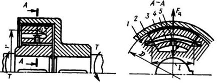 хема одной из центробежных муфт изображена на рис.. Центробежная сила Fц прижимает колодку 3 к барабану полумуфты 2. Этому препятствует сила F, возникающая от прогиба пружины 4. Величину силы F регулируют винтом 5. Соприкасание между колодкой и барабаном возможно при условии: